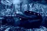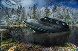 UFO, broken space saucer lies in the water on the banks of a river or lake after an accident and crash. Landscape with invasion by extraterrestrial space object