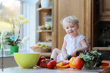 Toddler girl cutting cucumber preparing healthy vegetables salad