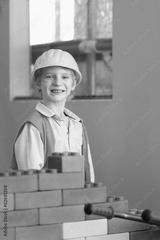 Happy boy in safety helmet playing indoors building house