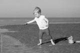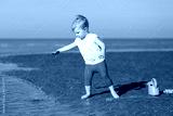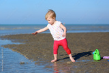 Toddler girl plays with watering can at a shore of the sea