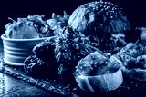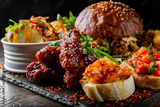 fast food set on plate. burger, potato chips, french fries, chicken wings, fried cheese and more on table.