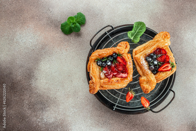 tartlet with berries, sweet pastries. banner, menu, recipe place for text, top view