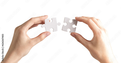 Hand joining, connecting two puzzle pieces together. Business and psychology concept of problem solving, success