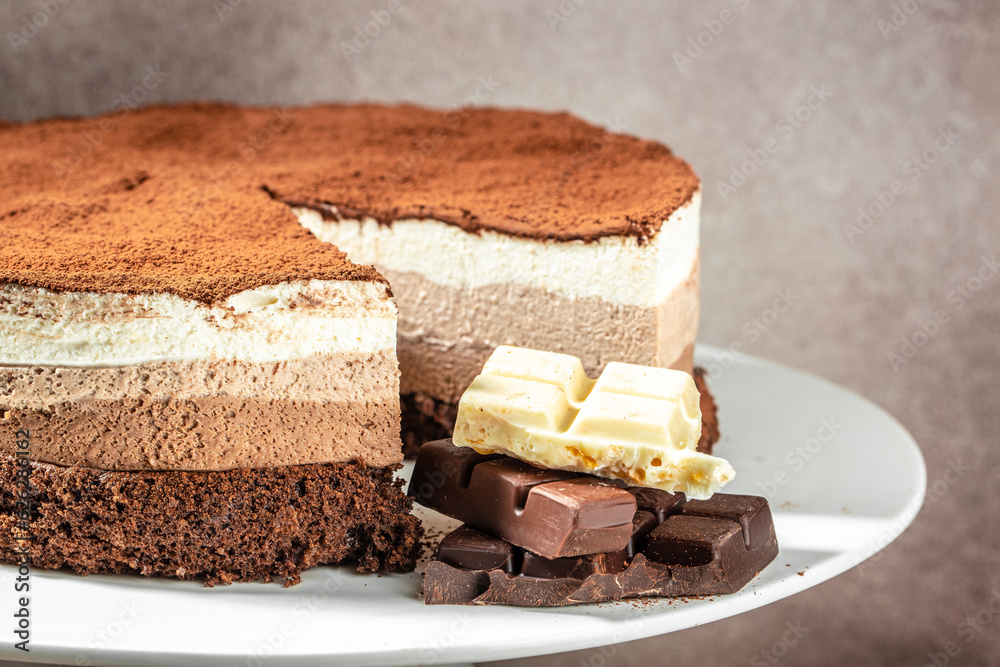 cake Three chocolates on a light background. Birthday, holidays, sweets, catering banner, menu, recipe