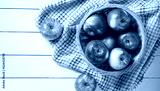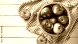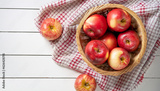 Ripe red apples in wooden box top view on rustic table. Wide apple banner with space for your text