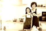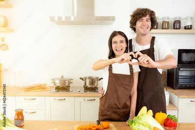 Young couple making heart shape with hands Smiling Young happy romantic beautiful woman handsome man in love showing heart symbol and shape in kitchen at home Enjoy cooking together Romantic concept