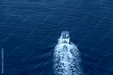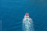 Aerial drone top boat floats in Mediterranean bay with deep blue sea.