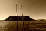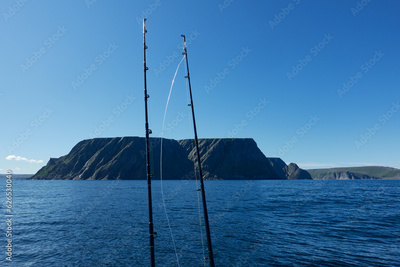 The northernmost tip of Europe large and dramatic rock cliff of North Cape and two fishing rods on summer day on Mageroya island in Finnmark in Northern Norway.