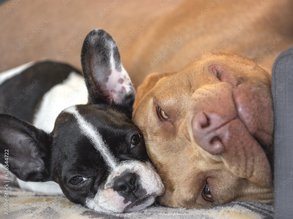 Cute puppy and adorable dog lie on the sofa in the living room. Clear, sunny day. Close up, indoors. Studio photo. Day light. Concept of care, education, obedience training and raising pets