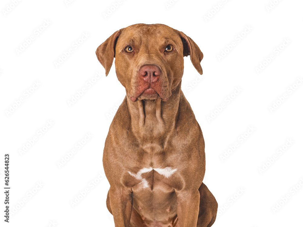 Cute brown dog. Isolated background. Close-up, indoors. Studio photo. Day light. Concept of care, education, obedience training and raising pets