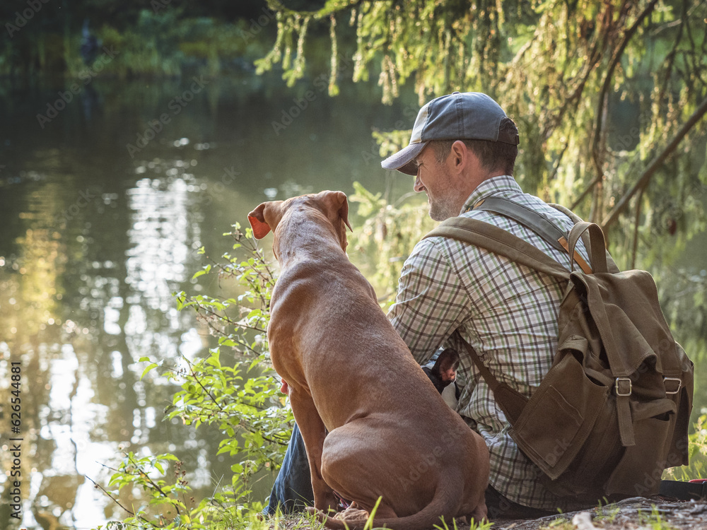 Charming, pretty brown puppy and attractive man. Close-up, outdoors. Day light. Concept of care, education, obedience training, raising pets