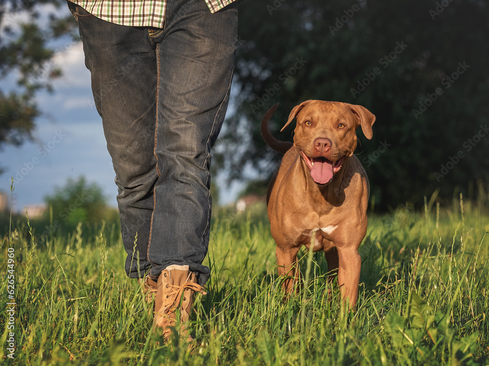 Cute dog and attractive man walking in the park against the backdrop of trees on a clear, sunny day. Closeup, outdoor. Day light. Concept of care, training and raising pets