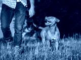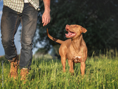 Cute dog and attractive man walking in the park against the backdrop of trees on a clear, sunny day. Closeup, outdoor. Day light. Concept of care, training and raising pets
