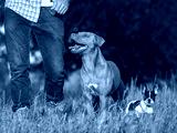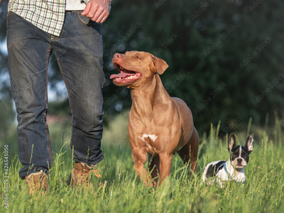 Charming dog, pretty little puppy and attractive man walking in the park against the backdrop of trees on a clear, sunny day. Closeup, outdoor. Day light. Concept of care, training and raising pets