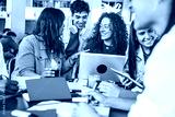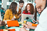 Multiracial university students sitting together at table with books and laptop - Happy young people doing group study in high school library - Life style concept with guys and girls in college campus