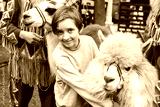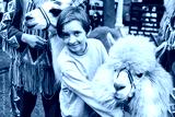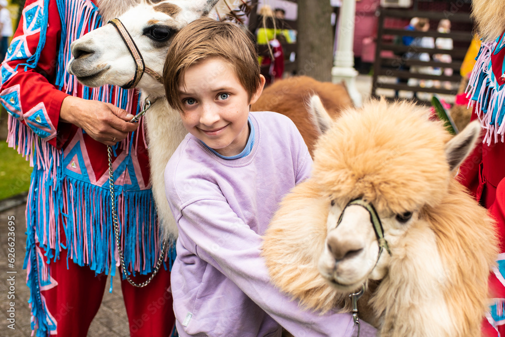 happy child stands with llama and alpaca. a joyful boy on a holiday, a birthday in a Latin American theme, stands next to animals, hugs an alpaca.
