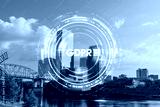 Panoramic skyline view of Broadway district of Nashville over Cumberland River at day time, Tennessee, USA. GDPR hologram, concept of data protection regulation and privacy for all individuals in EU