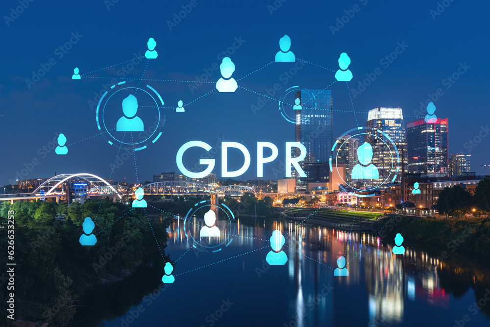 Panoramic view of Broadway district of Nashville over Cumberland River at illuminated night skyline, Tennessee, USA. GDPR hologram, concept of data protection regulation and privacy for individuals