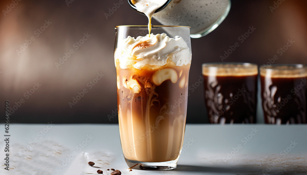 Iced coffee in a tall glass with cream poured over