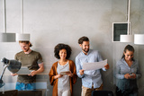 Smiling diverse colleagues gather in boardroom brainstorm discuss financial statistics together