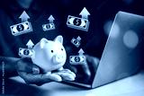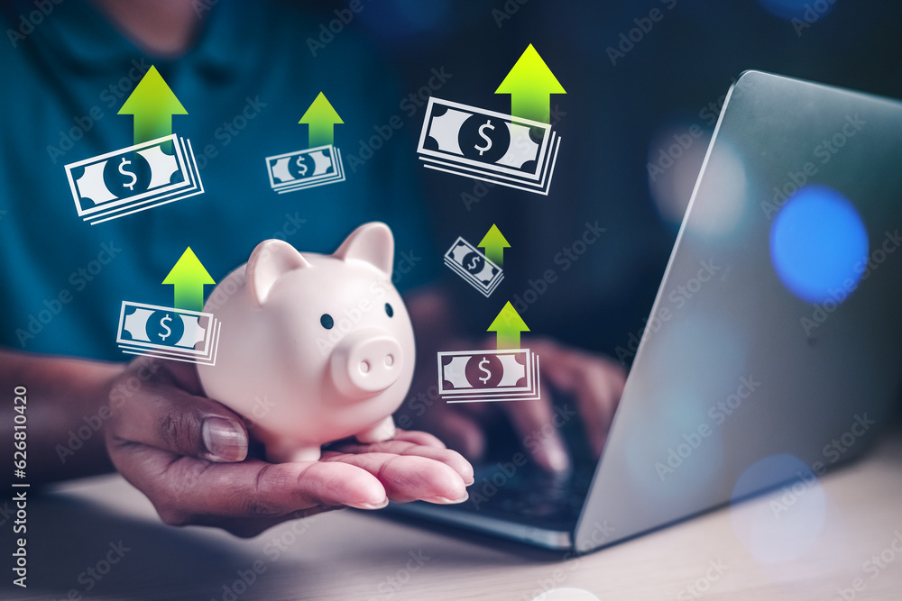 Saving investment plan, save for life concepts. Asian man using laptop planning save money in to piggybank. Saving for retirement, Education cost plan.