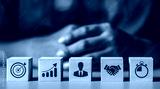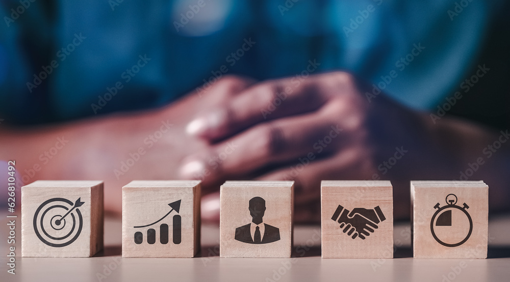 Investment for ultimate goals, stock and trade, business development, business cooperation and timings concept. Hand setting target wooden cube block with business strategy plan.