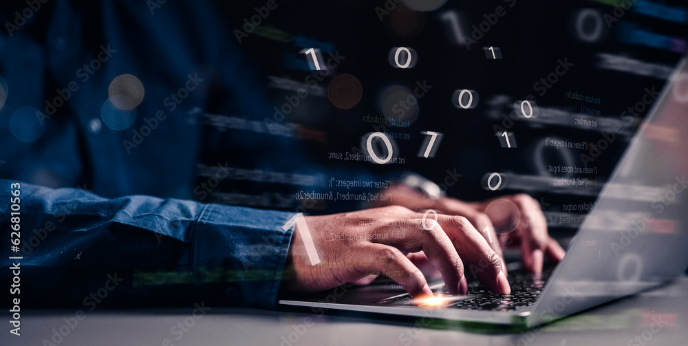 Concept digital and technology, coding, information, software, binary, engineer, development. Typing code and digit number information. Binary engineer development. computer hacking innovation.