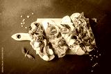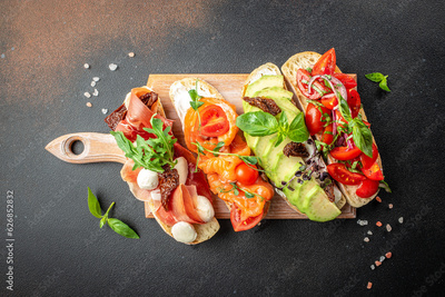 a set of bruschetta with prosciutto, salmon, tomatoes and avocado on a wooden board, banner, menu, recipe place for text, top view