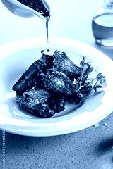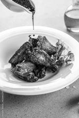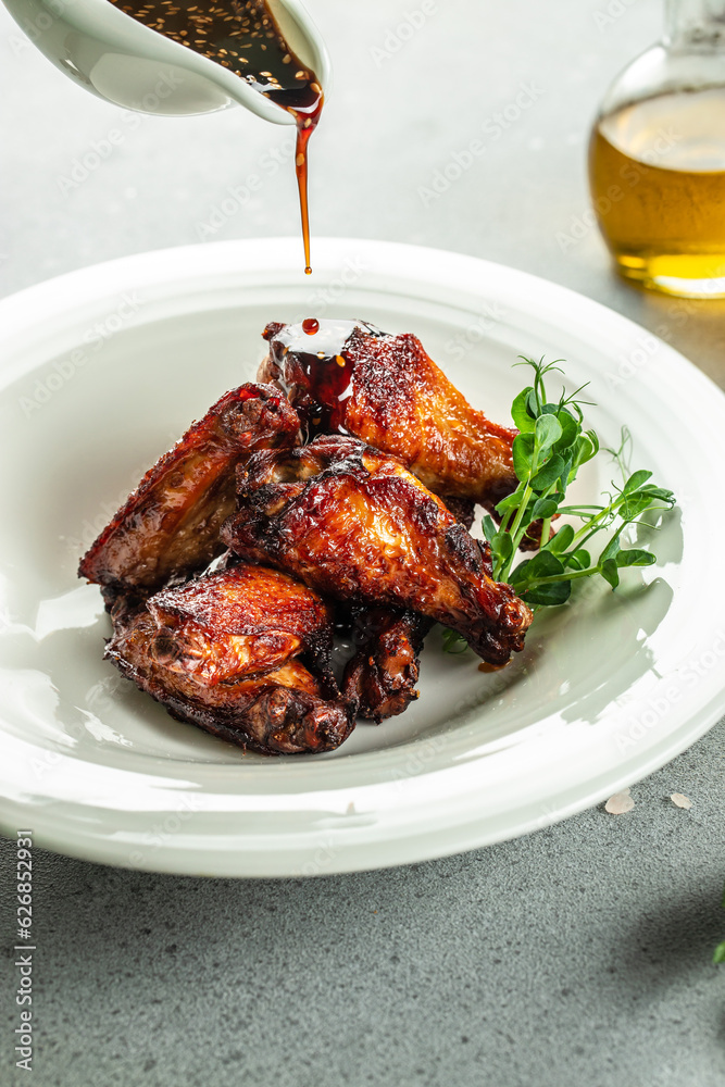 Baked chicken wings with sesame seeds and chili sauce. vertical image. top view. place for text