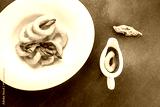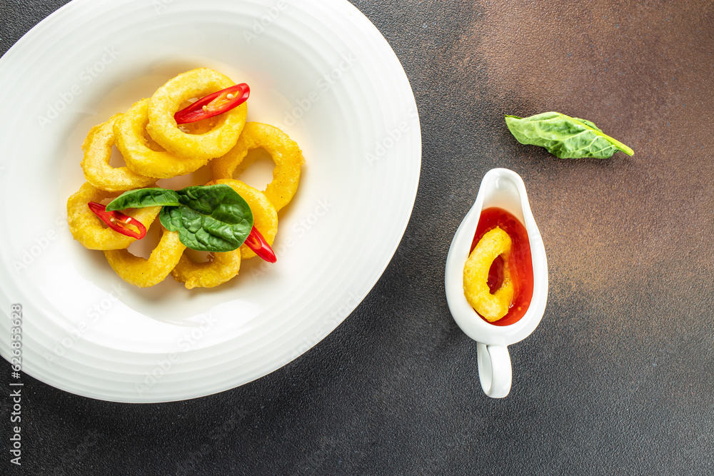 baked breaded calamari rings served with sweet chilli sauce on a light background. banner, menu, recipe place for text, top view