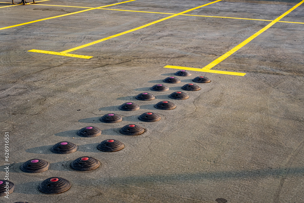 empty parking spaces with tire tracks