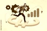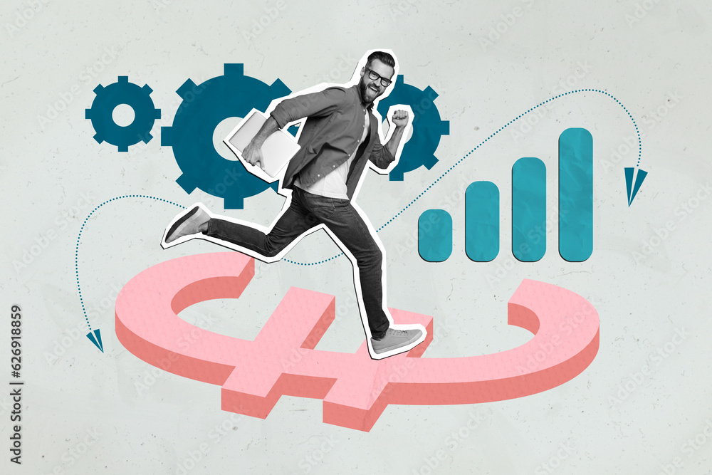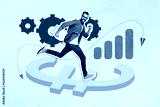 Picture collage concept euro currency growth economics countries works good businessman running trade money isolated on blue background