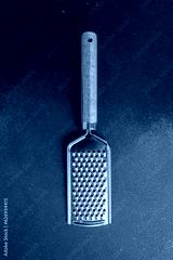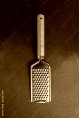 Golden metal grater with a wooden handle, vertical image. top view. place for text