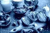 pouring oil on toast with ham and tomato. Spanish breakfast