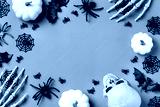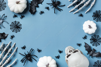 Halloween greeting card with pumpkin, skulls, bony hands and leaves