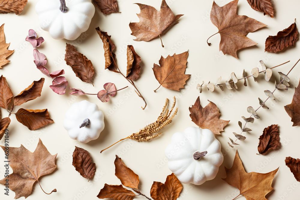 Autumn fall thanksgiving day composition with decorative pumpkins