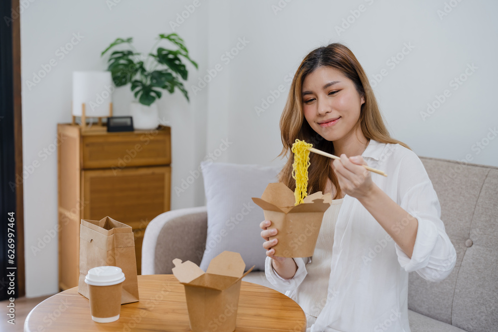 Food delivery. Happy asian woman eating noodles with chopsticks unpacking takeaway food at home.