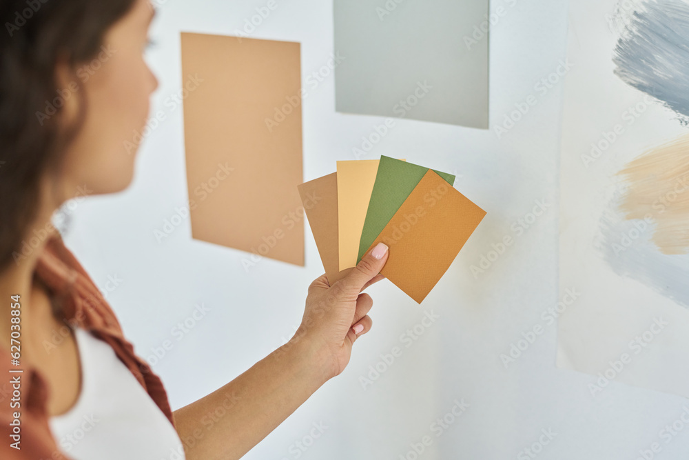Hand of young woman with palette of color swatches choosing one for walls of living room or bedroom during renovation of new apartment