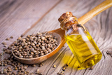 Hemp seeds and hemp seed oil on wooden background
