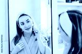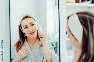 Young woman in bathrobe looking in mirror and making face massage with jade roller in the bathroom. The concept of natural procedures for skin care. Home Beauty self-care treatment. Selective focus