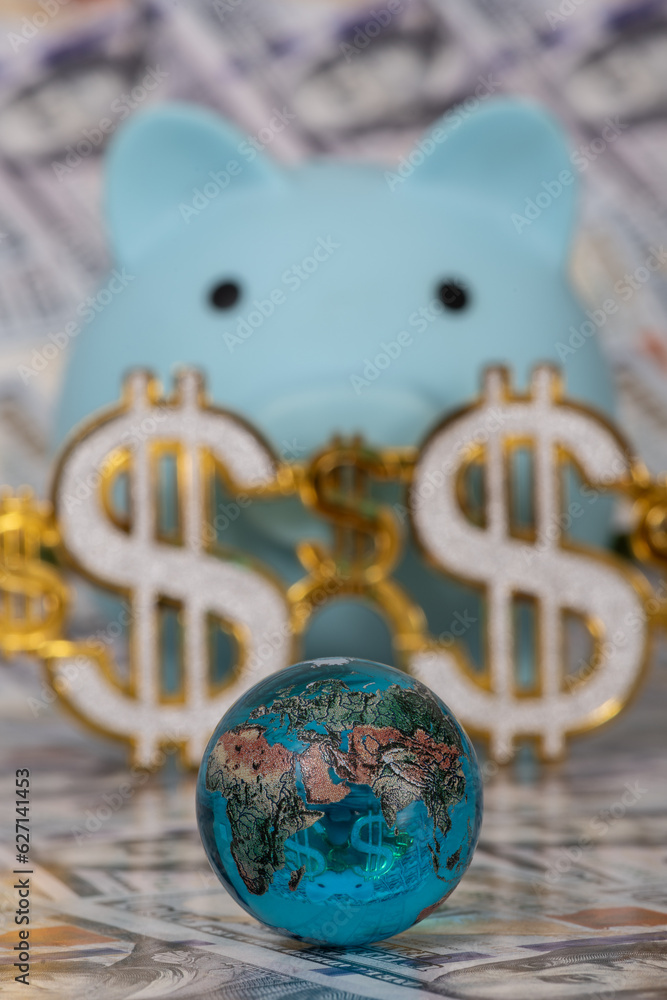 Glass globe, symbol of the American dollar, piggy banks and banknotes in denominations of 100 American dollars