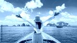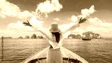 Happy traveler woman on boat joy fun nature panoramic view group of small island Andaman sea Krabi, Freedom adventure travel Phuket Thailand summer holiday vacation trips, Tourism destination Asia