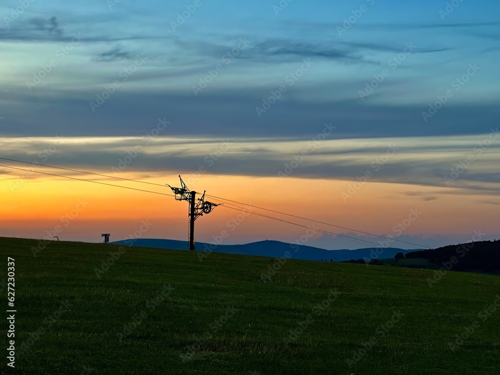 Dormant Giants: Industrial Silhouettes of the Ski Lifts Against a Tranquil Sunset in the Vosges Mountains