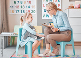 Girl child, psychologist and writing with talk, smile and listening for support, help and school counselling program. Woman, female kid and conversation for mental health, psychology and wellness