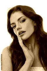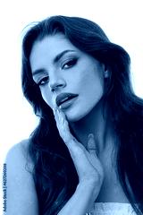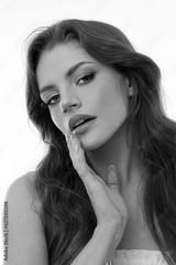 Portrait of beautiful brunette with big eyes and wavy long hair on isolated white background