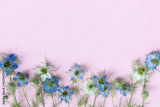 Blue and white nigella flowers on pink background. Minimalistic floral composition, top view and flat lay