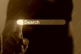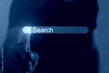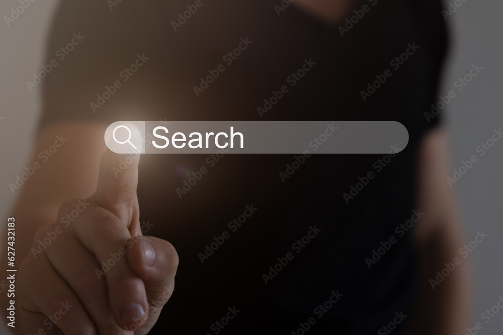 Data Search Technology SEO Search Engine Optimization concept. Man's hands typing on laptop computer keyboard surfing the internet to search for information on web browser.