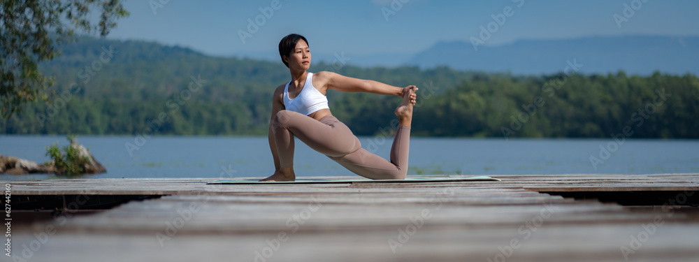 Beautiful attractive Asian woman practice fitness yoga pose on the pool above the Mountain peak in front of nature lake views, Feel so comfortable lifestyle and relax exercise in holiday morning