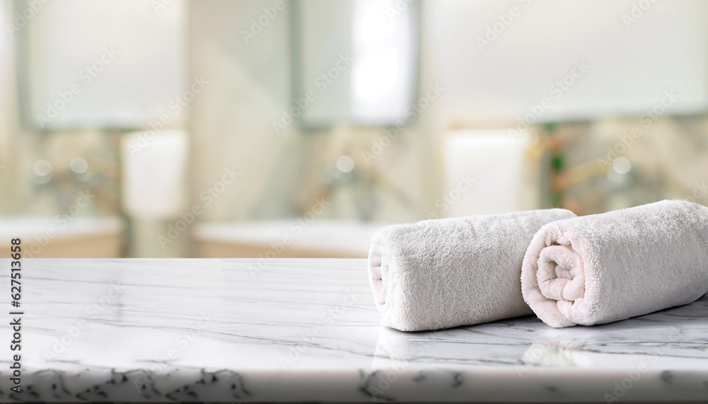 panorama shot : Towels on marble top table with copy space on blurred bathroom background. For product display montage.
