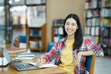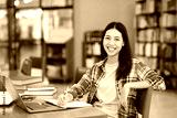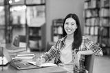 Portrait of a Smart Beautiful Asian Girl Studing and Reading Text Books Smiling Looking at Camera.